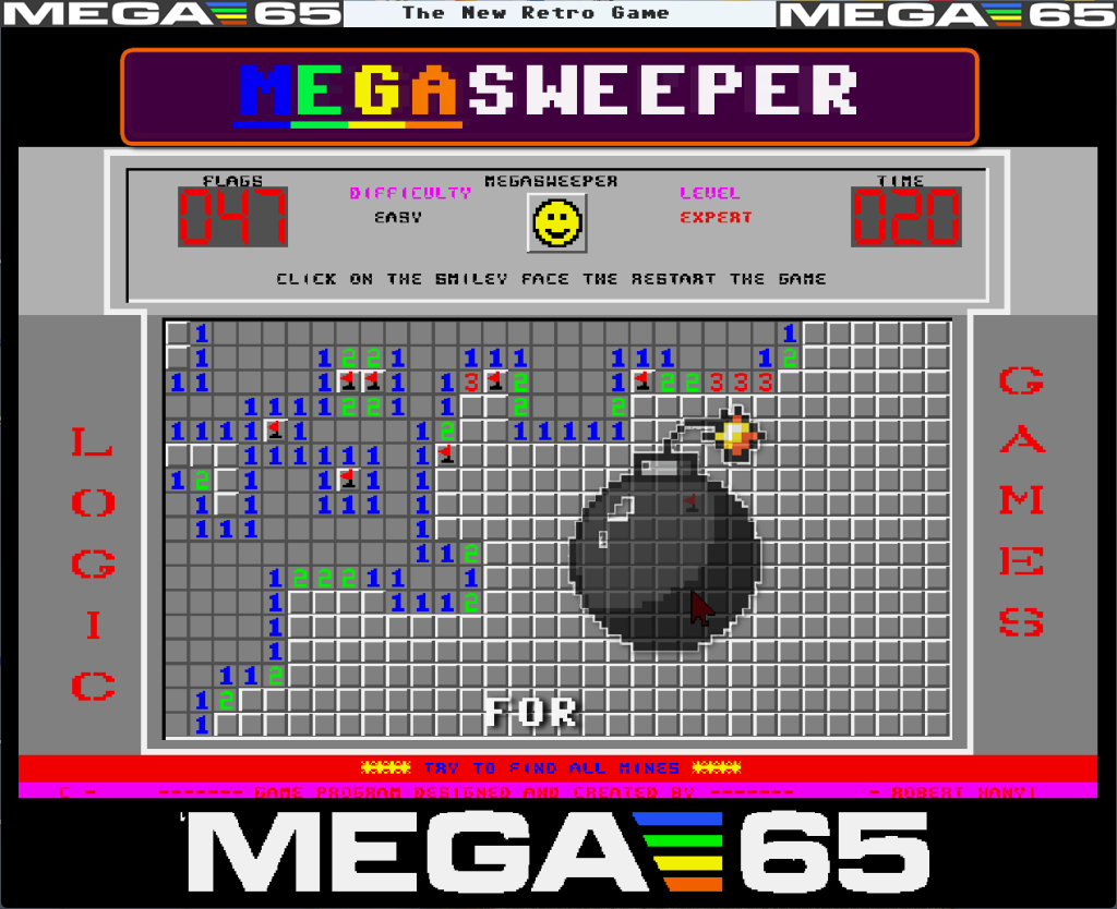 - MegaSweeper65 by Hanyic Róbert, a new faithful recreation of Minesweeper, enhanced with MEGA65 graphics and sound. Use a mouse in port 2 to place flags and guess the locations of the mines. Download the playable demo on Filehost, then proceed to the itch.io page to purchase the full version for just $6 USD.