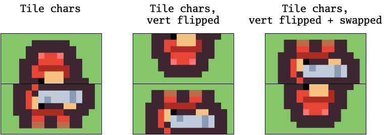 Of course, one possible solution is to have two tiles for each soldier, one facing to the left and one facing to the right. But the VIC-IV can help us out here. In the common case where we just want the same image flipped horizontally, we can just ask the VIC-IV to use the same graphic, and draw it flipped.