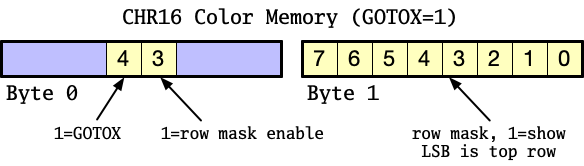 To enable the row mask, set the GOTOX instruction’s bit 3 of color memory byte 0. Then set the row mask using all eight bits of color memory byte 1. Each bit of the row mask corresponds to a pixel row, where bit 0 is the top-most row, bit 1 is the second row, and so on. Set the row mask bit to show the row.