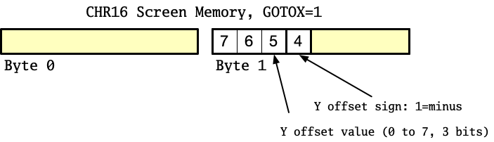 You set the Y offset using bits 4 through 7 of the GOTOX instruction’s screen memory byte 1. Bit 4 is the sign bit: set it for a negative offset, or clear it for a non-negative offset. Bits 5-7 are the value 0 through 7.