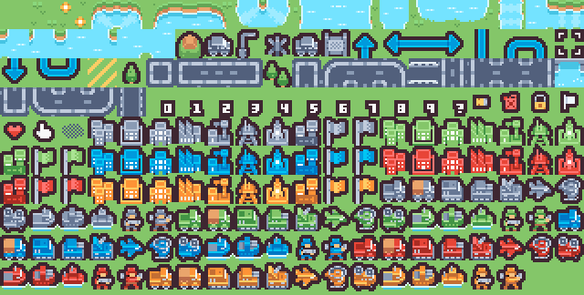 I’ve been playing around with this game tile set by Kenney intended for a military strategy game. There are tiles for fields, lakes, rivers, roads, and bridges to form a landscape, an assortment of military soldiers and vehicles in five color variations, and indicators and icons for user interface elements. The tiles are 16 pixels wide and tall and reasonably low color depth, so they seem suitable for a MEGA65 project.