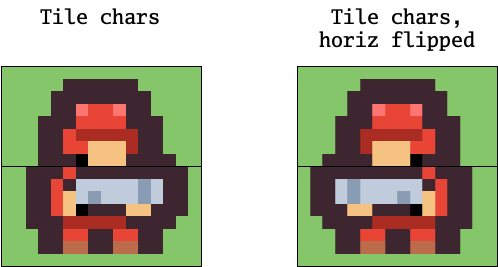 Of course, one possible solution is to have two tiles for each soldier, one facing to the left and one facing to the right. But the VIC-IV can help us out here. In the common case where we just want the same image flipped horizontally, we can just ask the VIC-IV to use the same graphic, and draw it flipped.