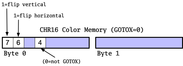 - Color memory declares that these are NCM characters, are flipped horizontally, use sub-palette $C, and use color $0 of that sub-palette for pixel value $F, like so: